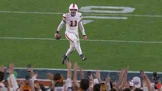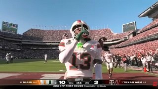 試合残り24秒、10-3でリードするマイアミ大学DB#13フィッツジェラルドが相手のパスを自陣エンドゾーン内でインターセプト、敵地テキサスA&M大学ファンを一瞬で静かにさせました。