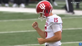 (オレゴン大学戦2Q、WR#3クーパーの芸術的キャッチによるパスを決めた後、小さくガッツポーズするインディアナ大学QB#15メンドーザ。 出典:CBS Sports College Football)