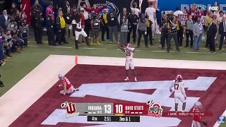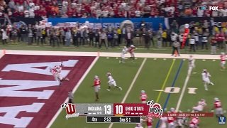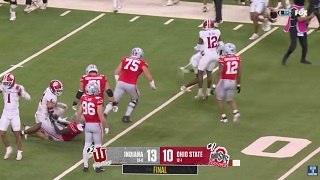 試合最後のプレイでパスキャッチ後に横たわるオハイオ州立大学WR#4J・スミスに手を差し伸べるインディアナ大学LB#4フィッシャー。しばしば見られる彼のフィールド上での紳士的な振る舞いは、キャプテンとしてチーム内に良い影響を与えているのかもしれない。